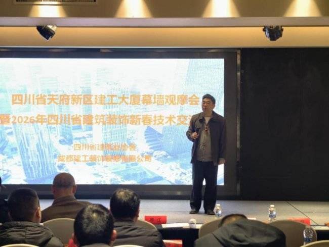 2026年2月5日上午,四川省建筑业协会装饰分会在成都天府新区福朋喜来登酒店组织召开了“四川天府新区建工大厦复杂高大装配式幕墙观摩会暨2026年四川省建筑装饰新春技术交流会”。四川省建筑业协会副秘书长、装饰分会秘书长张涛,中国建筑装饰协会公共建筑装饰工程分会秘书长罗胜,中国建筑装饰协会外联部主任李荣建,成都文理学院建筑学院院长牟江、四川建筑职业技术学院建筑系副主任、教授魏大平、 四川水利职业技术学院建筑学院院长、副教授李万渠、原中建西南建筑设计院资深建筑师李杰、成都西南交通大学设计院有限公司顾问总建筑师沈洪钊、以及来自高校、设计院、行业协会及施工企业的领导、专家、企业代表等近百人出席会议。