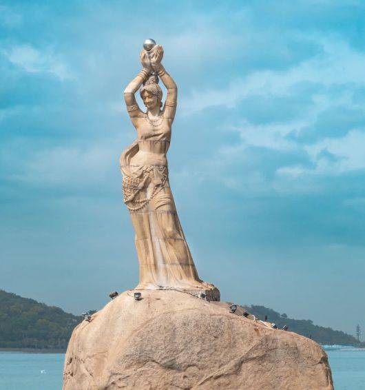 在珠海的香炉湾畔,矗立着一座花岗岩雕塑,它是珠海市的标志,也是这座滨海城市文化形象的重要组成部分。这座被称为“珠海渔女”的雕塑,以一位女性渔民的形象出现,身姿健美,面带微笑,身披渔网,裤脚轻挽,双手高擎一颗珍珠。她面朝大海,与身后蜿蜒的情侣路以及远处日月贝造型的珠海大剧院共同构成了一道独特的城市海岸线景观。