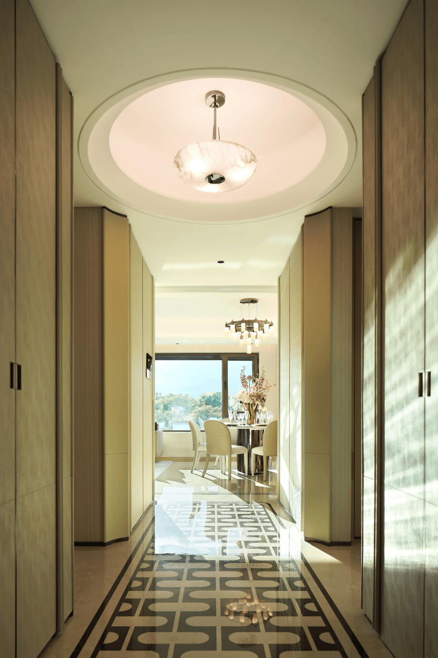 着眼室内,在建面约184㎡户型中,地面选用保加利亚黑和奥特曼米黄,采用无缝水刀拼花工艺,尊贵感和仪式感油然而生!