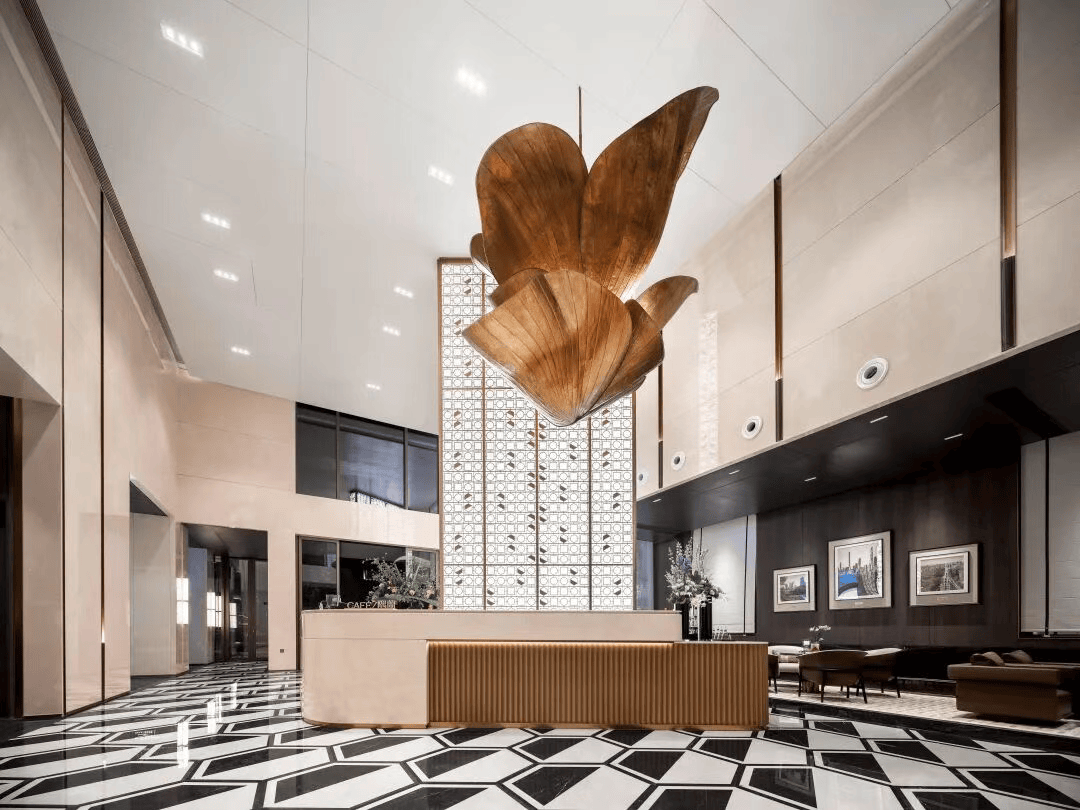 比如,项目打造全石材双归家大堂,归家大堂地面采用了香格里拉黑通铺,墙面是奥特曼米黄,背景墙则采用了莫奈花园大理石。项目的首层大堂与电梯厅采用梵高印象岩板,电梯轿厢选用冷翡翠大理石。